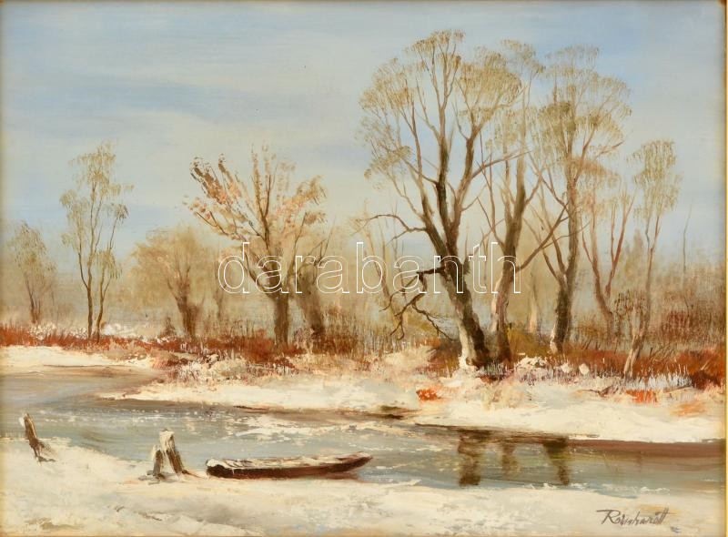 Reinhardt István (1936-): Tél. Olaj, farost (festék hibával), jelzett, keretben, 30×40 cm