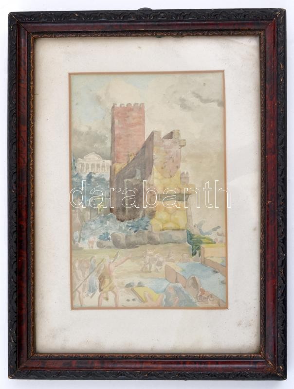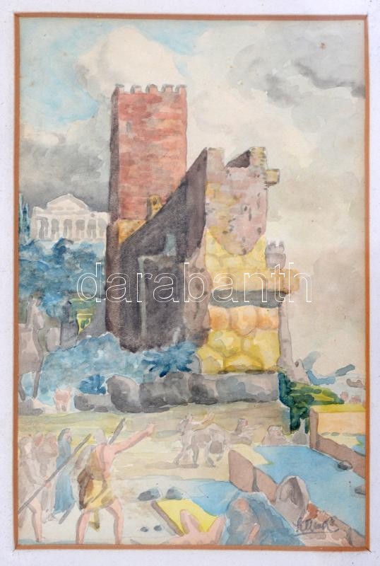 Szlima jelzéssel: Ókori jelenet, akvarell, papír, paszpartuban, üvegez...