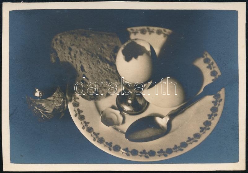 cca 1943 Thöresz Dezső (1902-1963) békéscsabai gyógyszerész és fotóművész hagyatékából, jelzés nélküli vintage fotó (Lágy tojás reggelire), 6x8,5 cm