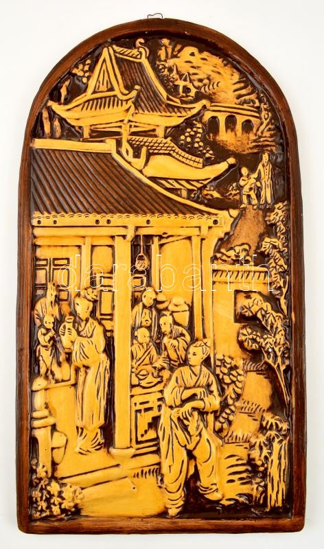 2 db kerámia falikép. Szecessiós kerámia , Kínai jelenetes mázas kerámia jelzés nélkül, apró kopásnyommal, apró lepattanással, 51x28 cm.