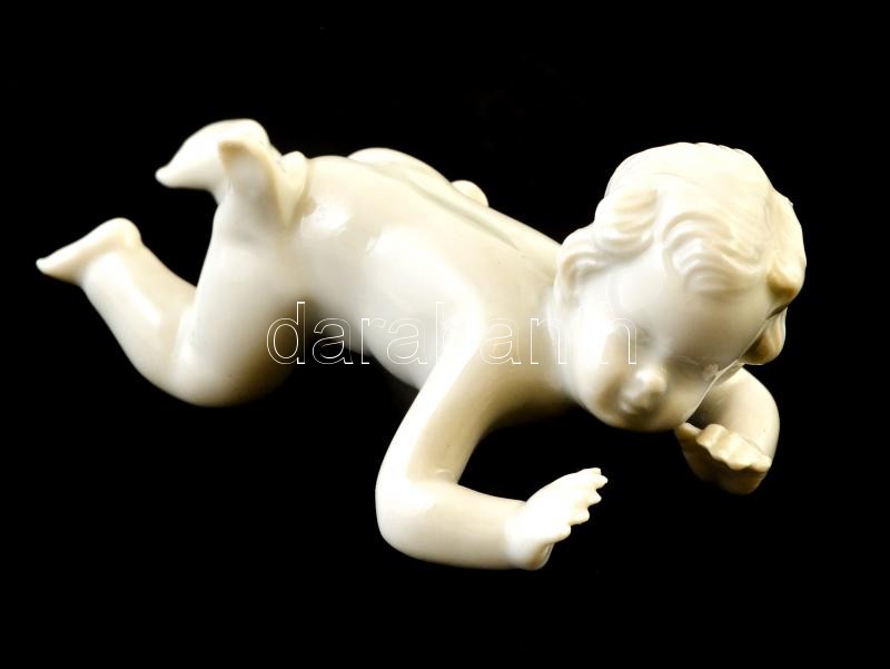 Unterweissbach fekvő puttó, fehér mázas, jelzett, kopás nyomokkal, h:8 cm