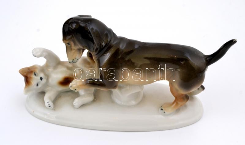 Wagner & Apel Bertram játszó kutya és macska , kézzel festett, jelzett, kopásnyomokkal, m:6,5 cm, h:14,5 cm