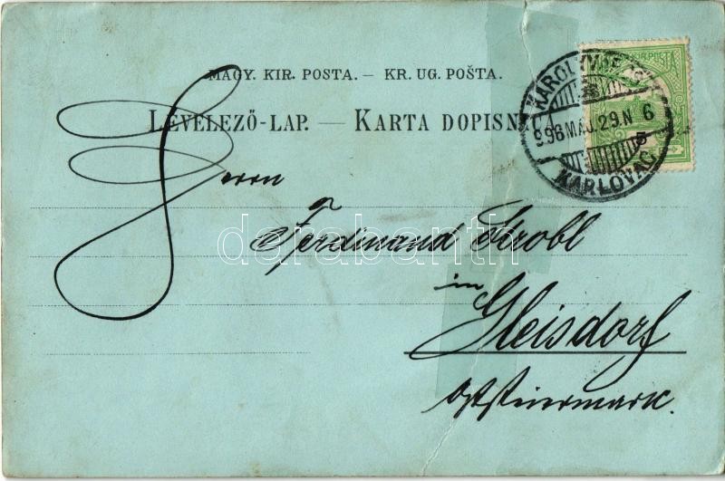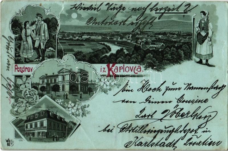 1898 Károlyváros, Karlovca, Karlovac; Zorin Dom, Kuca I. Sagana, Grad Karlovac / színház, népviselet, folklór, I. Sagana üzlete és saját kiadása / city theatre, Croatian folklore, shop of I. Sagana. O.Z.M. 1316. Art Nouveau, floral, litho (r)