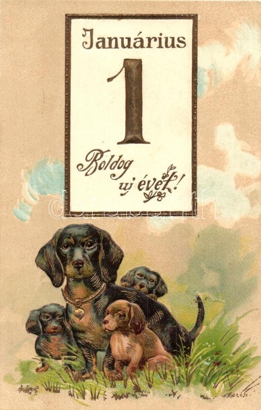 Boldog Újévet / New Year greeting, January 1st, dogs, Emb. litho