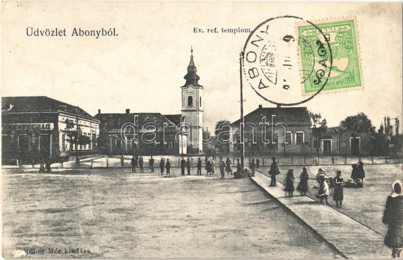 Abony, Református templom, Perényi, Brück Adolf üzlete, piaci árusok. Kiadja Müller Mór