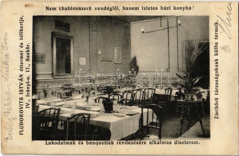 https://www.darabanth.com/en/356-Online-auction/356.0/Postcards/Hungary~1500005/Budapest-V-Fludorovits-Istvan-etterme-es-telikertje-etterem-belso-Iranyi-utca-17-Saskor~II2039950