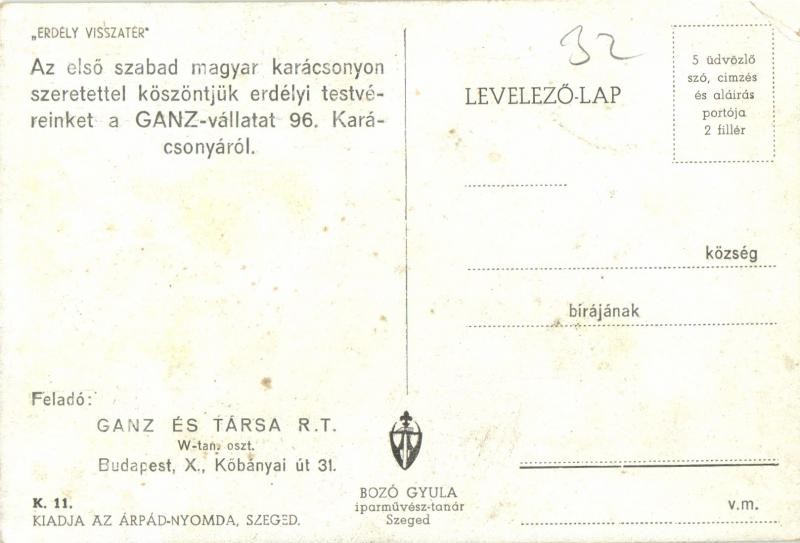 Description: Boldog Magyar Karácsonyt! Erdély visszatér. "Az első szabad magyar karácsonyon szeretettel köszöntjük erdélyi testvéreinket a Ganz vállalat 96. Karácsonyáról" / Hungarian irredenta propaganda, Christmas greeting s: Bozó (EK)