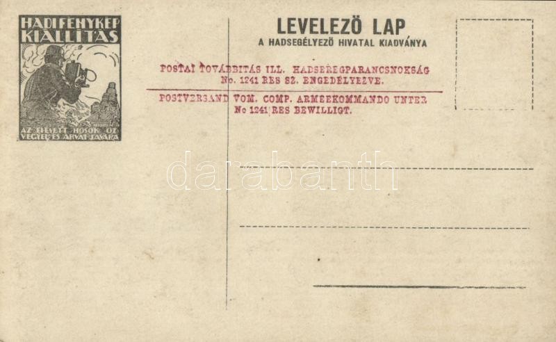 Description: Zsidó istentisztelet a lövészárokban. 66/II. zászlóalj. Grausz Sándor főhadnagy felvétele. Hadifénykép Kiállítás. Judaika / WWI Austro-Hungarian K.u.K. military, Jewish worship in the trenches at the front. Judaica + "Postai továbbítás ill. Hadseregparancsnokság No. 1241. Res. Engedélyezve" "Postverband vom. comp. Armeekommando unter No. 1241. Res. bewilligt"