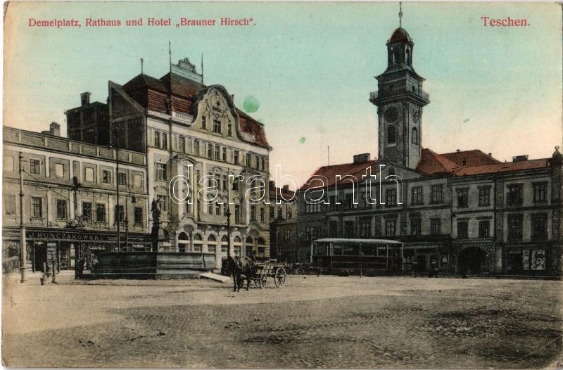 Cieszyn, Teschen; Demelplatz, Rathaus und Hotel "Brauner Hirsch" / square, town hall, hotel, J. Konczakowski's shop, tram (fl)