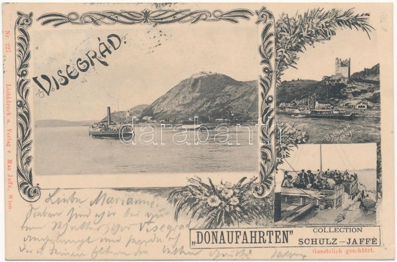 Description: 1900 "Visegrád" gőzüzemű oldalkerekes személyhajó Visegrádnál a Salamon tornyánál és a várnál / "Donaufahrten". Lichtdruck u. Verlag v. Max Jaffé, Wien. Nr. 227. / on the board of passenger steamship "Visegrád". Schulz-Jaffe Collection. Art Nouveau, floral