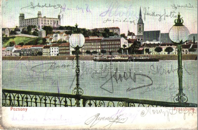1907 Pozsony, Pressburg, Bratislava; látkép, rakpart, vár. "Bedie...