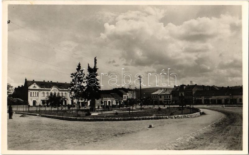 1939 Ipolyság, Sahy; Horthy Miklós tér, Hotel Lengyel szálloda, vendéglő, Gyógyszertár, Ligeti József, Kertész, Adler, Matzner, Brack, Martsan Béla üzlete, Hanza szövetkezet. Kiadja Polgár I. / church, hotel, restaurant, pharmacy, shops, cooperative shop