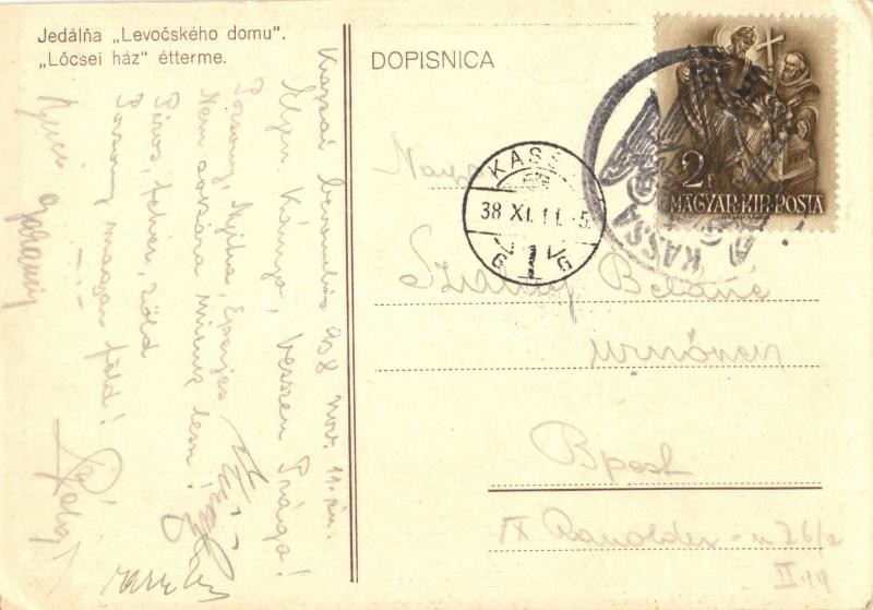 Kassa, Kosice; Lőcsei ház étterem, belső / Jedálna Levocského domu / restaurant interior "1938 Kassa visszatért" So. Stpl (EK)