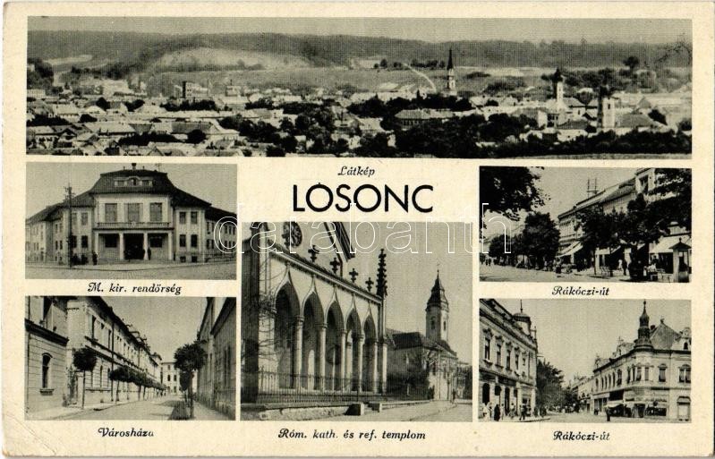 Losonc, Lucenec; látkép, M. kir. rendőrség, Rákóczi út, Városháza, Római katolikus templom, Református templom, üzletek. Kiadja Filó Marcell / general view, police station, street view, town hall, Catholic church, Calvinist church, shops (EK)