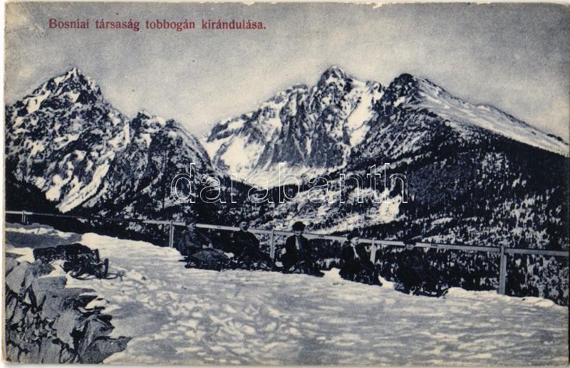 Tátra, Magas Tátra, Vysoké Tatry; Boszniai társaság tobogán kirándulása, téli sport, szánkó / winter sport in the High Tatras, sledding people