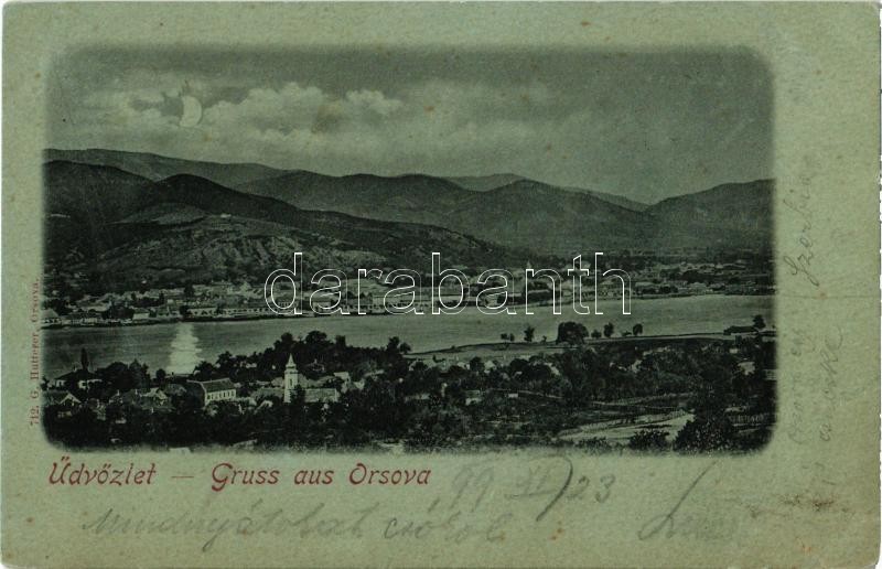 1899 Orsova, látkép holdfényben. Kiadja G. Hutterer 712. / general view, in moonlight