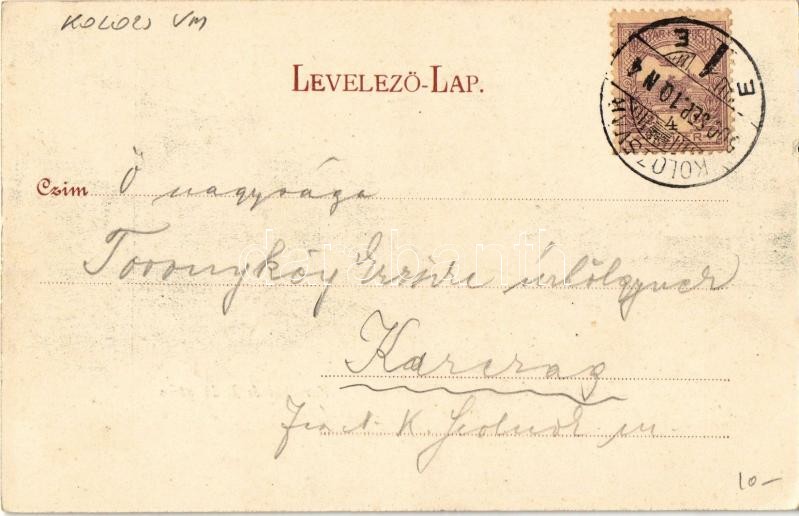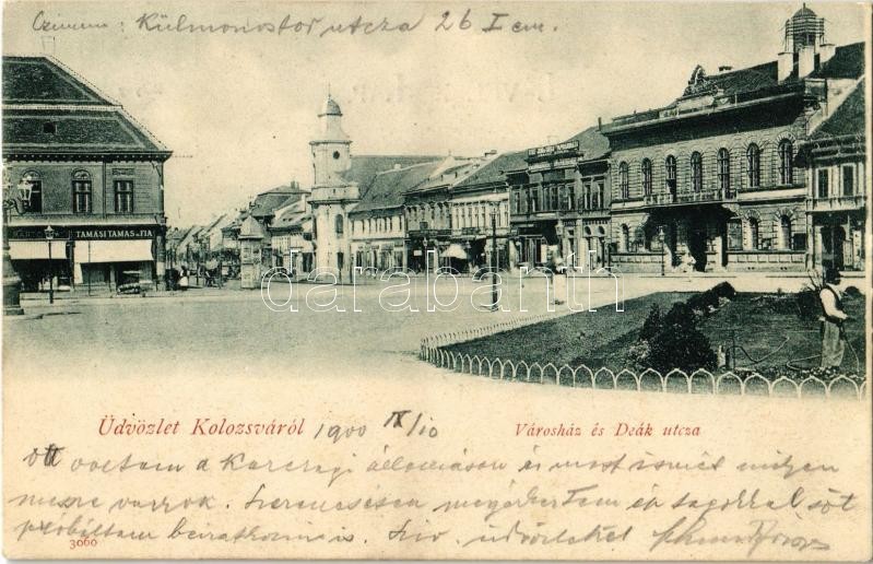 1900 Kolozsvár, Cluj; Városháza és Deák utca, Tamási Tamás és Fia, Stief Jenő és Társa üzlete, kávéház, Evangélikus templom, növények locsolása slaggal / town hall, street view, shops, café, Lutheran church, man watering the plants with hose