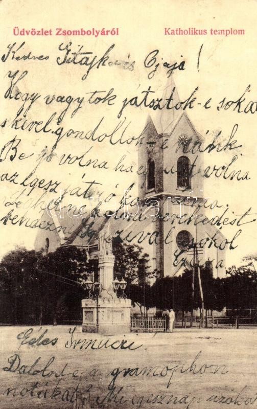 1906 Zsombolya, Hatzfeld, Jimbolia; Katolikus templom szoborral. W.L. ...