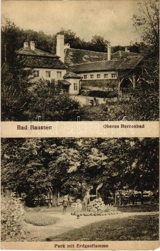 Description: 1917 Bázna-fürdő, Felsőbajom, Baiumul de Sus, Baassen, Baile Bazna; Felső Úri fürdő, park a földgáz lánggal / Oberes Herrenbad, Erdgasflamme / spa, natural gas flame