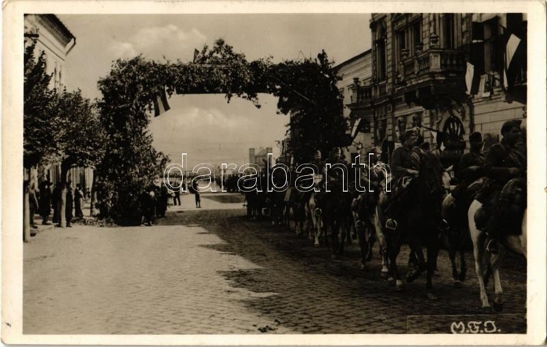 1940 Dés, Dej; bevonulás, díszkapu, magyar zászlók / entry of the Hungarian troops, decorated gate, Hungarian flags + "M. kir. 1. honvéd gépkocsizó dandár felderítő zászlóalj parancsnokság"