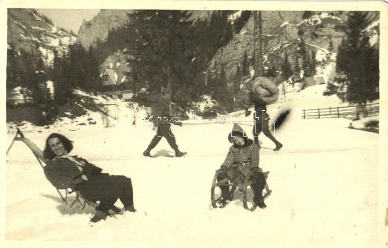 1944 Gyergyószentmiklós, Gheorgheni; szánkózás a Gyilkos-tónál, téli s...