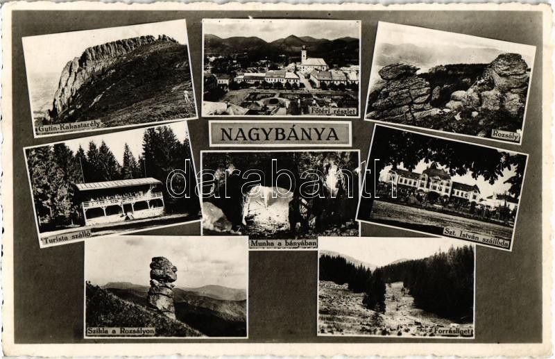 Nagybánya, Baia Mare; Gutin-Kakastarély, Fő tér, Rozsály, Turista szálló, Munka a bányában, Szikla a Rozsályon, Szent István szálloda, Forrásliget / Muntii Gutai, Varful Ignis / mountain, main square, tourist hotel, chalet, rock, mine, hotel