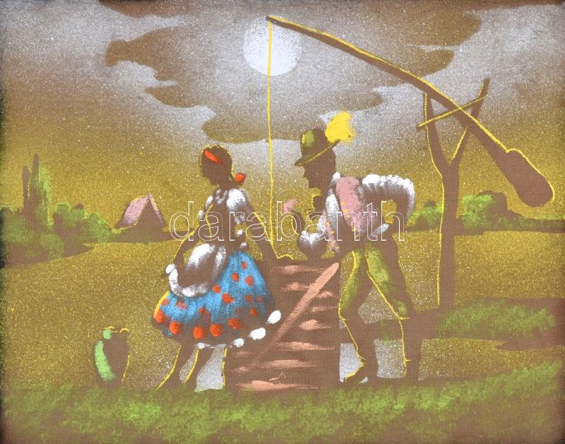 Jelzés nélkül: Holdfényes találka, dekoratív festett selyemkép, fa keretben, 19,5×25 cm