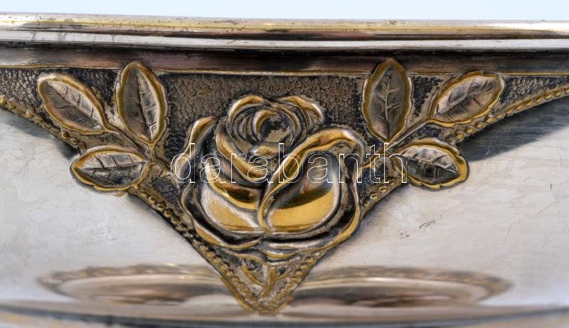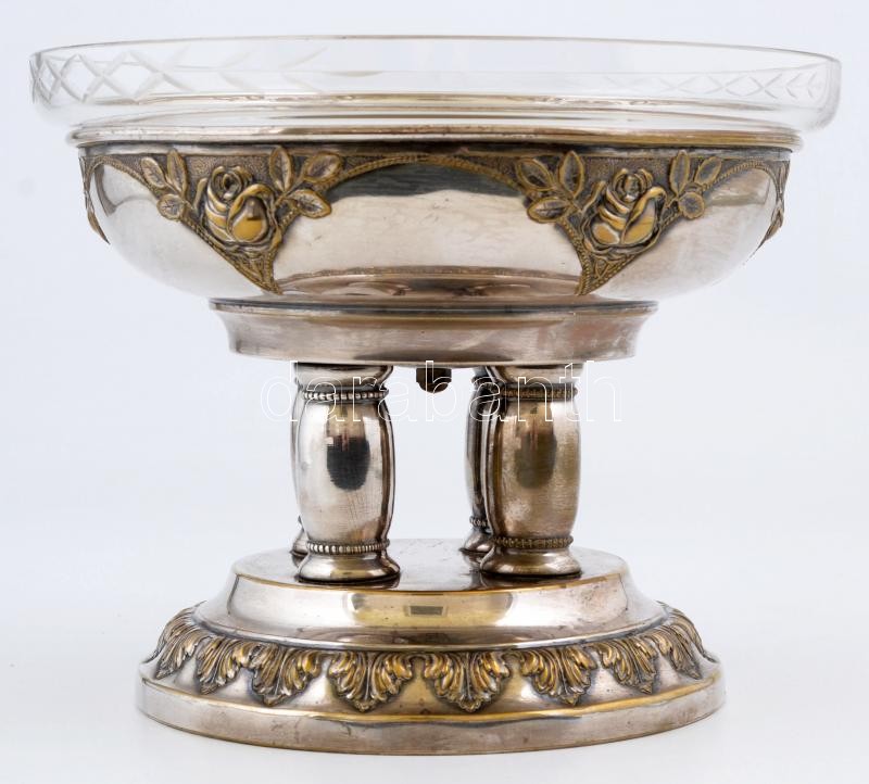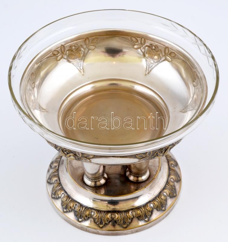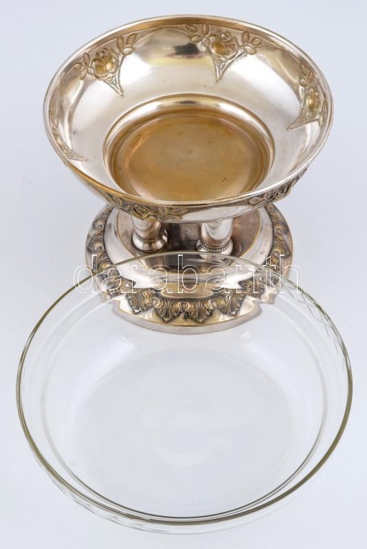 Rendkívül dekoratív osztrák ezüstözött alpakka kínáló, üvegbetéttel, ...