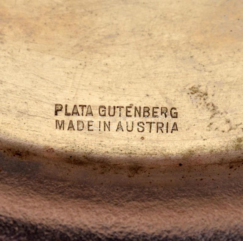 Rendkívül dekoratív osztrák ezüstözött alpakka kínáló, üvegbetéttel, d: 23 cm