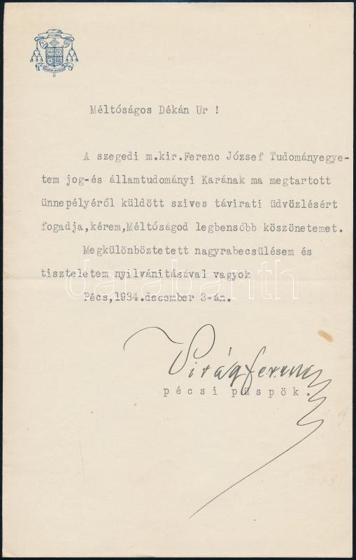 1934 Virág Ferenc pécsi püspök gépelt, aláírt levele Iványi Béla történész-levéltáros, egyetemi dékán részére, fejléces papíron