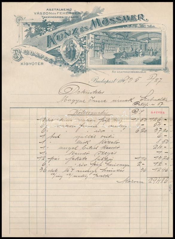 1905 Bp. Kígyó tér, Kunz és Mössmer cég "A szép juhásznéhoz" vászonárú üzlete litografált fejléces számlája, hajtva, jó állapotban