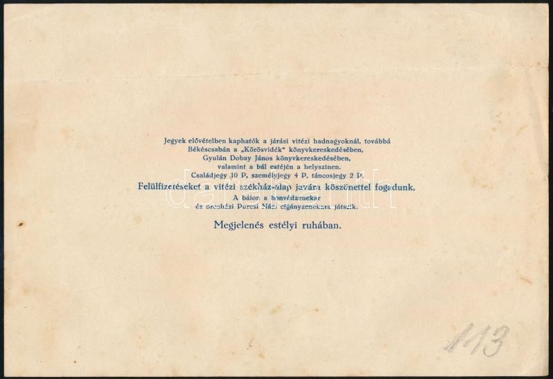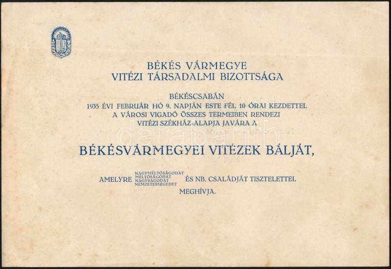 1935 Békés vármegyei Vitézi Társadalmi Bizottság meghívója a vitézi bá...