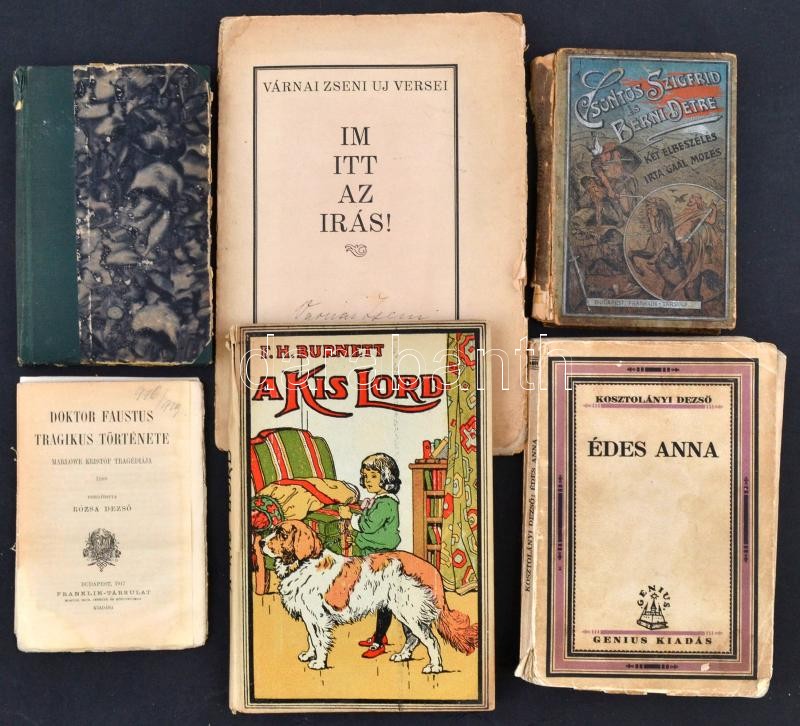 Vegyes könyv tétel, változó állapotban, többnyire sérült, vagy viseltes, rossz állapotban, 6 db: Kosztolányi Dezső: Édes Anna. Bp.,én.,Genius. Kiadói papírkötés. Karinthy Frigyes: Tanár úr kérem. Vértes Marcell rajzaival. Bp., é.n., Dick Manó. Kiadói félvászon-kötésben. F. H. Burnett: A kis lord. Bp., én., Tolnai. Kiadói illusztrált kartonált papírkötésben. Gaal Mózes: Csontos Szigfrid és a Nibelungok. Bp., 1905, Franklin. Kiadói illusztrált egészvászon-kötésben. Doktor Faustus tragikus története. Marlowe Kristóf tragédiája. Ford.: Rózsa Dezső. Bp.,1917, Franklin, 98 p. Borítóhiánnyal, szétvált lapokkal, felvágatlan. Várnai Zseni: Im itt az írás! Hiányos, csak 16 oldal, a szerző által aláírt címlappal.