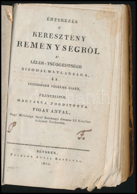 [Vauge,Gilles]: Értekezés a keresztény reménységről a lélek-tsüggedtsége, bizodalmatlansága és felesleges félelme ellen. Ford.: Pigay Antal. Bécs, 1820, Pilchler Antal, 315+5 p. Kopott vászon-kötésben, hiányos gerinccel.