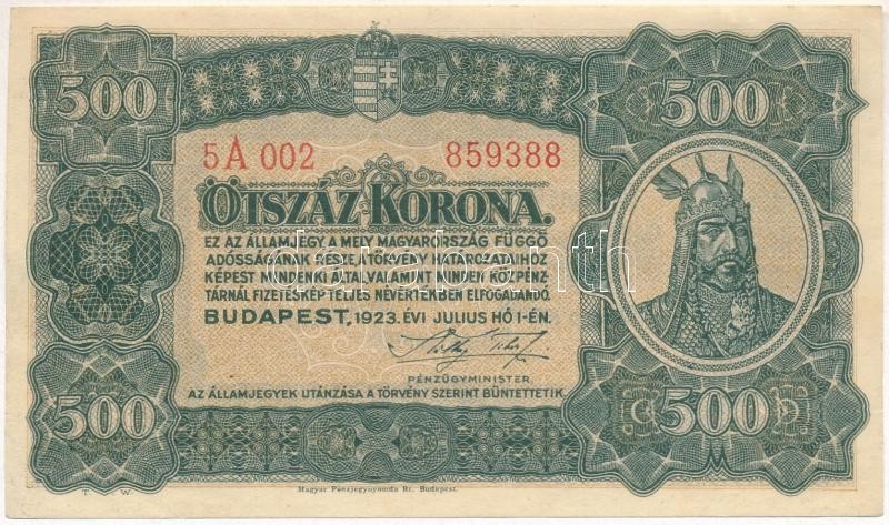 1923. 500K "Magyar Pénzjegynyomda Rt. Budapest" nyomdahely jelöléssel ...