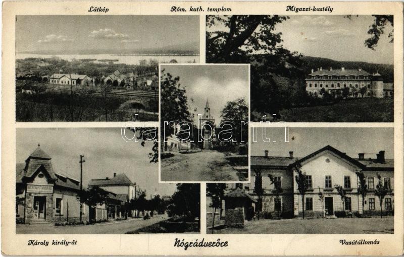 Verőce, Nógrádverőce; látkép, vasútállomás, Római katolikus templom, Migazzi kastély, Károly király út. Kiadja Berényi