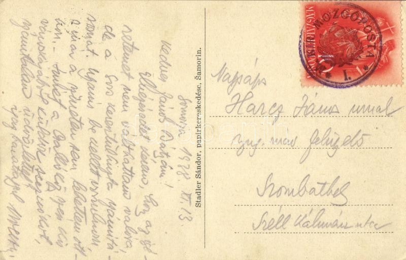 Description: 1938 Somorja, Samorín; Rim. kat. kostol, Mestianska skola / Szlovák polgári iskola és katolikus templom, automobil. Kiadja Stadler Sándor / Slovak school, Catholic church, automobile + "M. KIR. MOZGÓPOSTA I." bélyegző (EK)