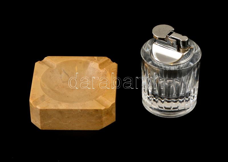 Öngyújtó üveg és fém elemekből, m: 8 cm + márvány hamutartó, 8×8×3 cm