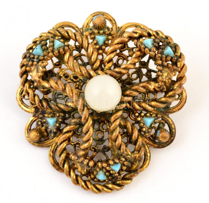 Réz kitűző türkiz és fehér színű díszítéssel, d: 4 cm