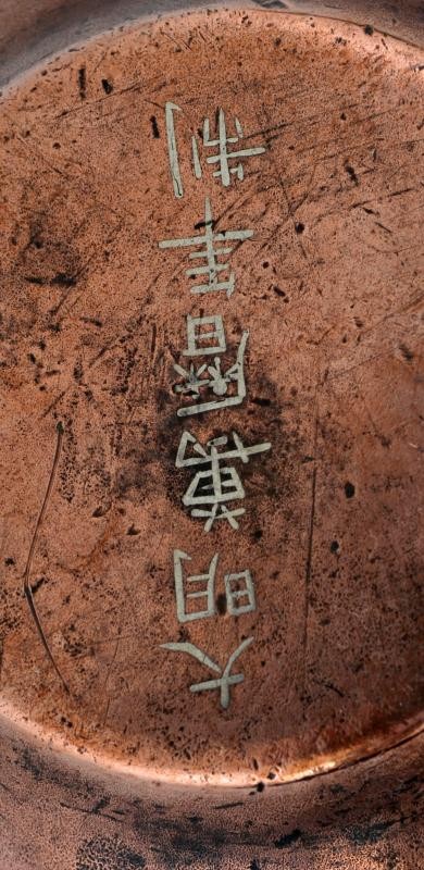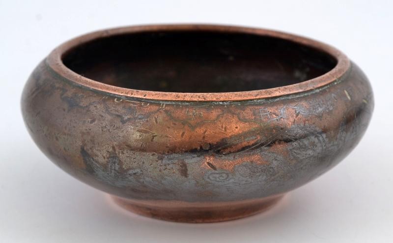 Tibeti bronz tálka, jelzett, kopott, d: 10 cm