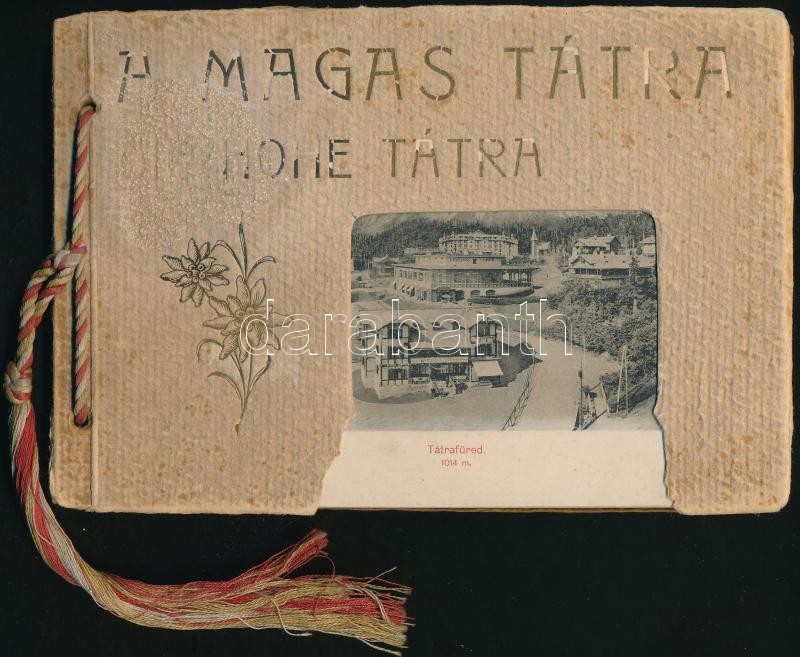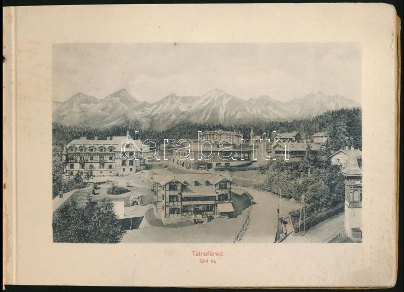 cca 1900 A Magas-Tátra. Hohe Tatra. hn.,én., ny.n., 21 t. (Fekete-fehér fotók.) Kiadói haránt-alakú zsinórfűzött papírkötésben, kopott, sérült borítóval, de belül jó állapotban. / cca 1900 High Tatras, 21 piecies of black-and-white photographs. Paperbinding, with worn and damaged cover, but the other things are okay, in Hungarian language.
