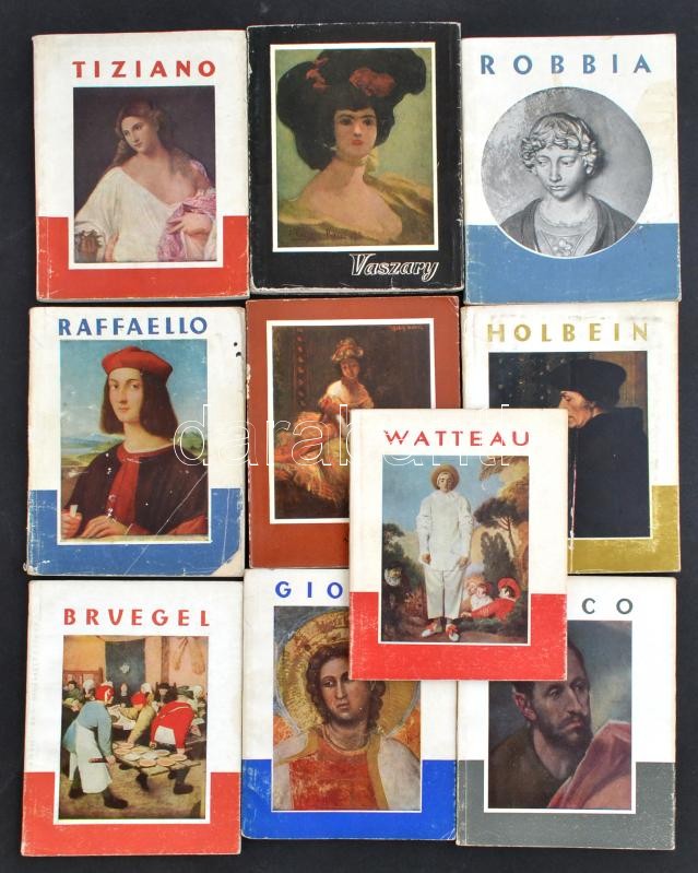 A művészet kiskönyvtára 10 kötete: Robbia, Vaszary, Raffaello, Holbein, Székely, Bruegel, Giotto, Greco, Watteau, TIziano . Bp.,1963-1967, Corvina-KépzÅ‘művészeti Alap Kiadóvállalata. Kiadói papÃrkötés, jó állapotban.
