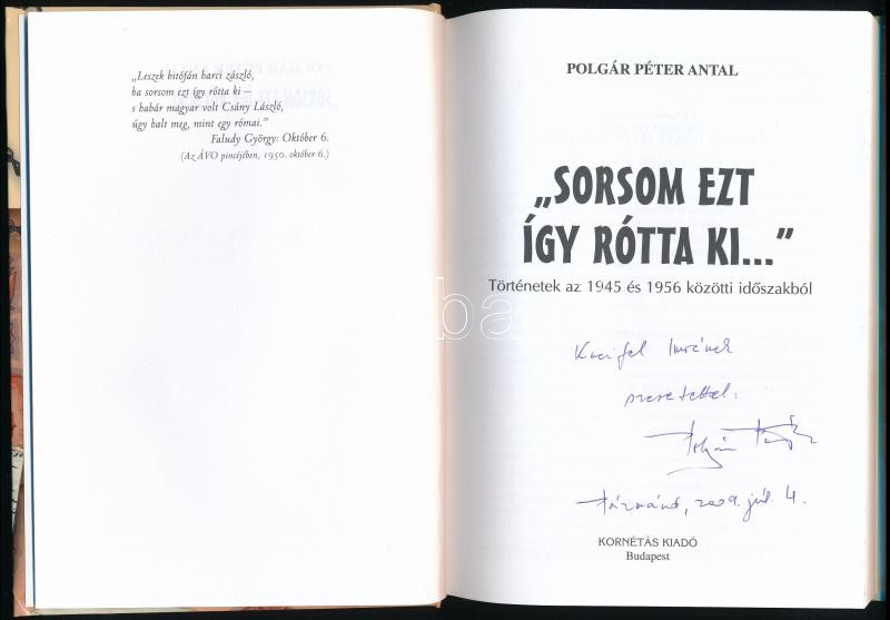 Description: Polgár Péter Antal: "Sorsom ezt így rótta ki..." Történetek az 1945 és 1956 közötti időszakból. Bp.,2007,Kornétás. Kiadói kartonált papírkötés. A szerző által dedikált.