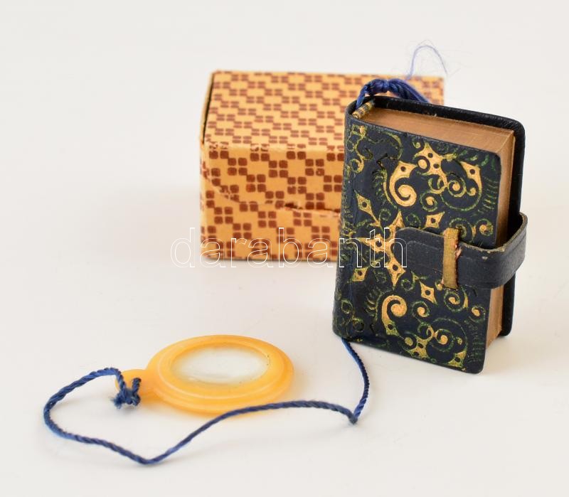 Miniatűr Korán aranyozott lapszélekkel, nagyítóval, kis tékában. 37 mm