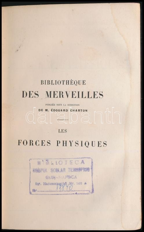 Achille Cazin: Les Forces Physiques. A. Jahandier szövegközti illusztrációival. Bibliothéque des Mervilles. Paris, 1869, L. Hachette et C. Francia nyelven. Kiadói aranyozott egészvászon-kötés, festett lapélekkel, intézményi bélyegzőkkel, foltos.
