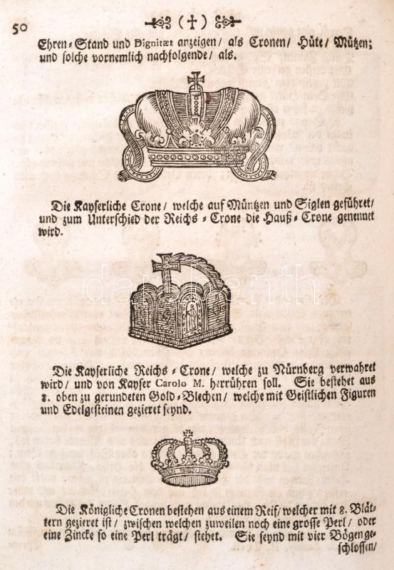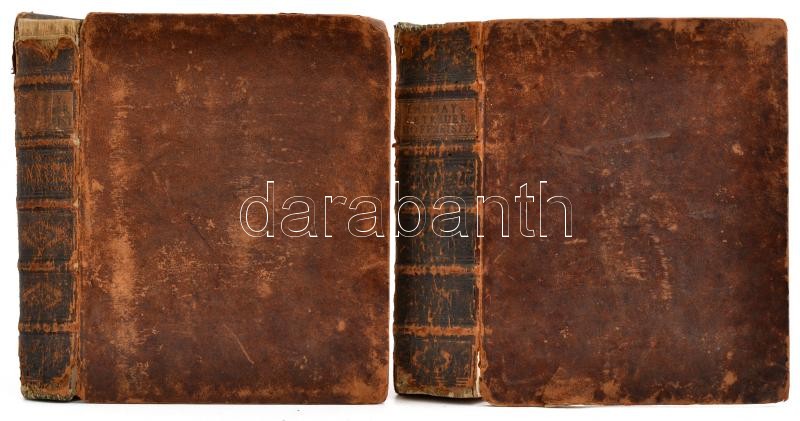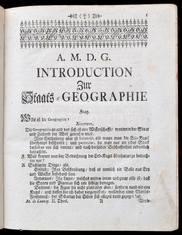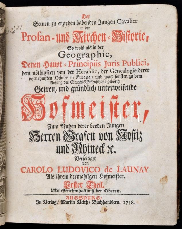 Launay, Carl .Ludovico. de.: Der Seinen zu erziehen habenden Jungen Cavalier in der Profan- und Kirchen-Historie, So wohl als in der Geographie, Denen Haupt-Principiis Juris Publici, dem noethigsten von der Heraldic, der Genealogie derer vornehmsten Haeuser in Europa/ und was sonsten zu dem Anfang der Staats-Wissenschafft gehoerig Getreu, und gruendlich unterweisende Hofmeister, Zum Nutzen derer beyden Jungen Herren Grafen von Nostiz und Rhineck. Ester und Anderter Theil. 2 kötetben Augsburg, 1738 Martin Veith 1t (címkép) [12], 270p, [22] 6 kihajtható metszettel (térképek, leszármazási tábla);440p. (22). Számos egészoldalas és kihajtható táblával, térképpel, leszármazási táblával. Korabeli, gerincén sérült egészbőr kötésekben. Launay munkája a világ országainak leírása, gazdagon illusztrált tudományos munka. ./ With lots of engraved tables and fold outs (maps and heraldic table) In damaged full leather binding.