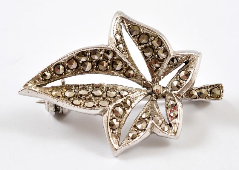 Ezüst(Ag) markazitos levél kitűző, jelzett, 3,2×2,3 cm, bruttó: 4,8 g