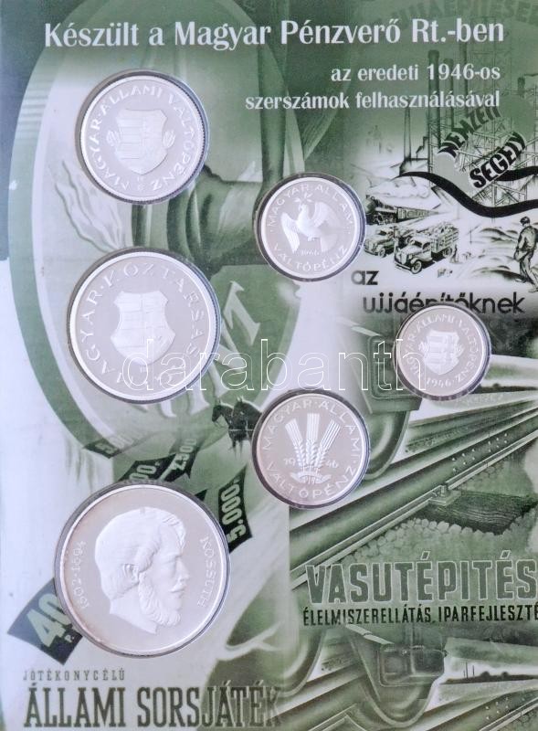 2006. "Mesterdarabok ezüstből 1946" 1946. 2f-5Ft Ag (6xklf) forgalmi sor utánverete eredeti díszcsomagolásban T:PP Hungary 2006. "Silver master pieces 1946" 1946. 2 Fillér - 5 Forint Ag (6xdiff) restrike coin set in original case C:PP