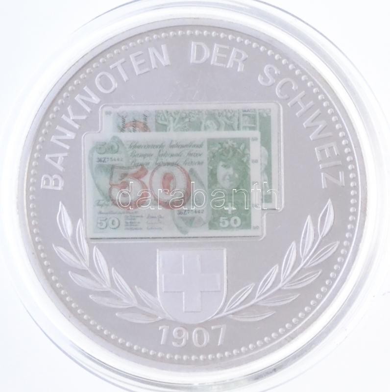 Svájc DN "Banknoten der Schweiz 1907 / Billets de Banque de Suisse - Banconote della Svizzera" ezüstözött Cu-Ni emlékérem 50Fr svácji bankegy multicolor képével (40mm) T:PP Switzerland ND "Banknoten der Schweiz 1907 / Billets de Banque de Suisse - Banconote della Svizzera" silver plated Cu-Ni commemorative medallion with the multicolor image of 50 Francs banknote (40mm) C:PP