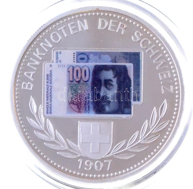 Svájc DN "Banknoten der Schweiz 1907 / Billets de Banque de Suisse - Banconote della Svizzera" ezüstözött Cu-Ni emlékérem 100Fr svájci bankjegy multicolor képével (40mm) T:PP Switzerland ND "Banknoten der Schweiz 1907 / Billets de Banque de Suisse - Banconote della Svizzera" silver plated Cu-Ni commemorative medallion with the multicolor image of 100 Francs banknote (40mm) C:PP